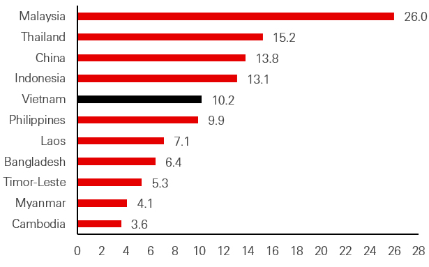 While Vietnam’s manufacturing and outputs are becoming more sophisticated, the country remains in early stages of technological adoption. Continued advancement in manufacturing capabilities will be needed to maintain its high economic growth rates and sustain an advantage over neighbouring countries with similar demographics.