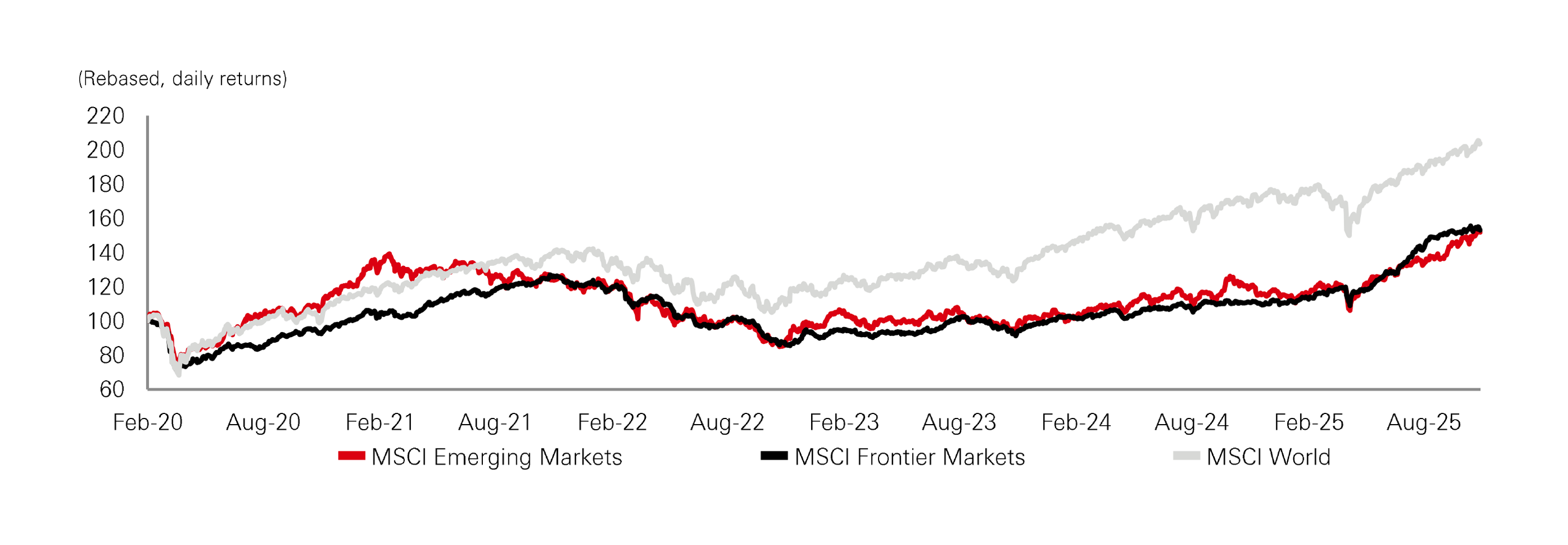 Source: HSBC Asset Management, Bloomberg, as of 31 October 2025. Frontier Markets: MSCI Frontier Markets Daily TR Net USD; Emerging Markets: MSCI Emerging Markets Daily TR Net USD; Developed Markets: MSCI World Daily TR Net USD. Past performance does not predict future returns.