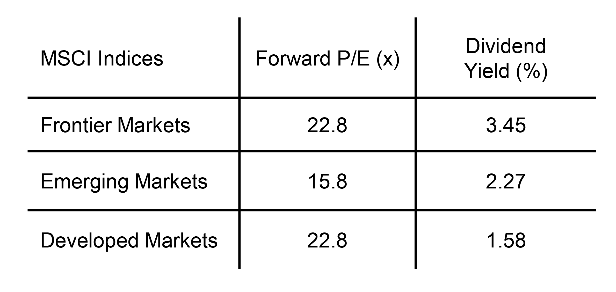 Frontier markets are trading at attractive valuation levels. They offer higher earnings growth and dividend yield than emerging market peers