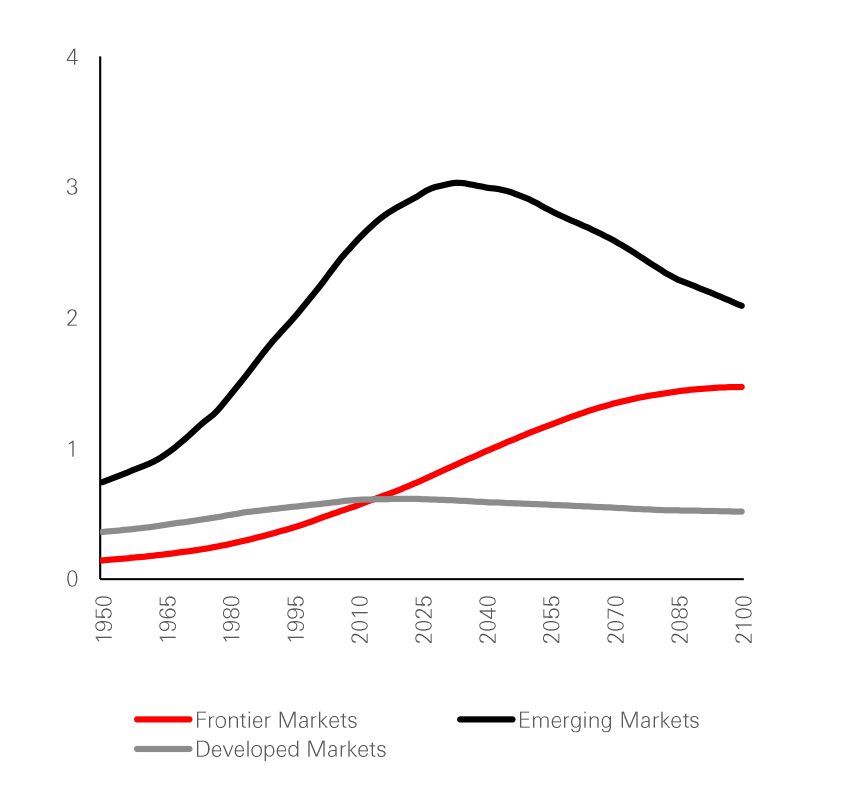 3. Source: United Nations, UN, World Population Prospects 2024. HSBC Research, February 2024. Based on the median fertility rate assumptions. Aggregate of countries comprised in respective MSCI indices, (MSCI World, Emerging Markets and Frontier Markets). The views expressed above were held at the time of preparation and are subject to change without notice.The views expressed above were held at the time of preparation and are subject to change without notice. Any forecast, projection or target where provided is indicative only and not guaranteed in any way.