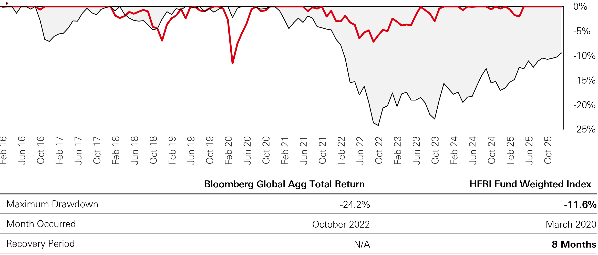 3. & 4. & 5. Source: HSBC Alternative Investments Limited, Bloomberg, HFRI Inc. As at January 2026. Performance period February 2016 to January 2026 of the HFRI FWI is the HFRI Fund Weighted Index and the Bloomberg Global Aggregate Total Return Index. There is no guarantee the trend illustrated by the charts above will continue.