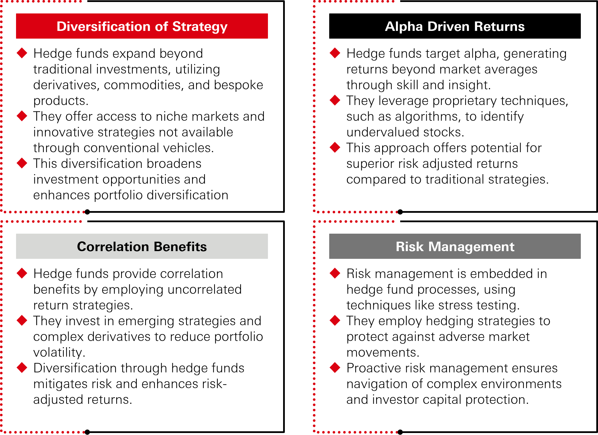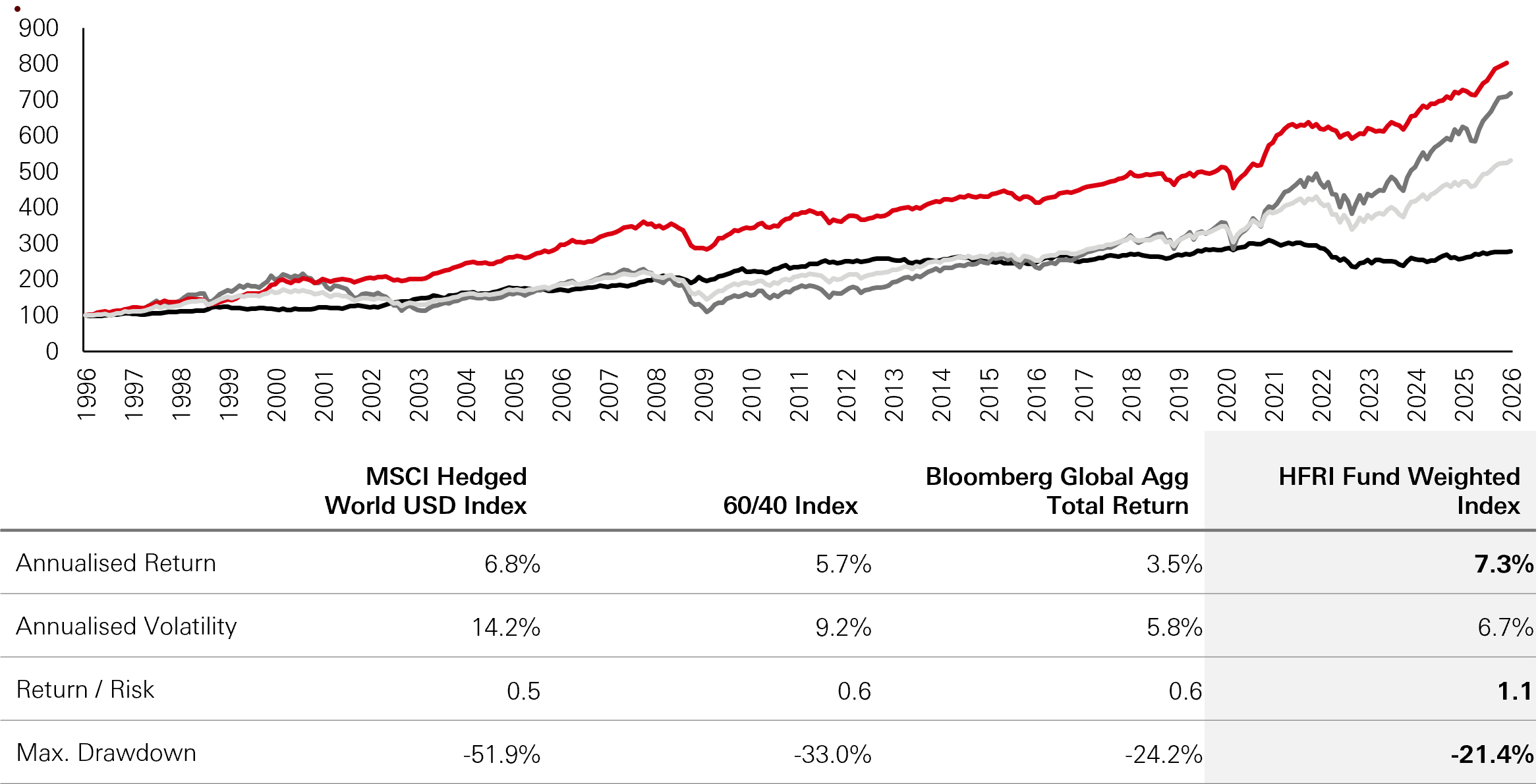 6. Source: HSBC Alternative Investments Limited, Bloomberg, HFRI Inc. As at January 2026. Performance period May 1996 to January 2026. Performance of the HFRI Fund Weighted Index, Bloomberg Global Aggregate Total Return Index, MSCI Hedged World USD Index and the 60/40 index (represented by a 60 per cent allocation to MSCI Hedged World USD Index & a 40 per cent allocation to the Bloomberg Global Aggregate Total Return Index. There is no guarantee the trend illustrated by the chart above will continue.