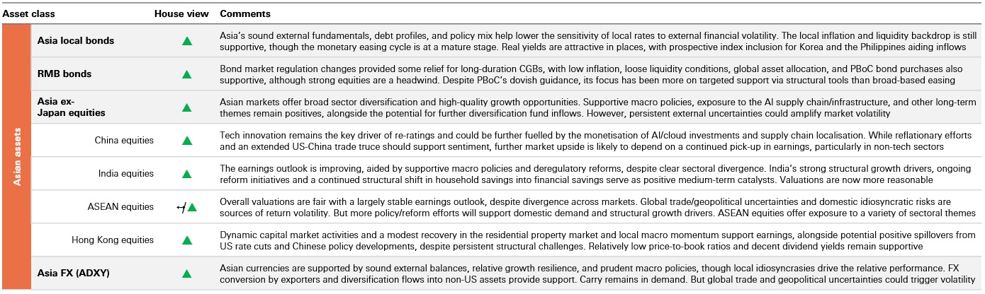 - For Asia ex Japan equities, the underweight, overweight and neutral categories for the region at the aggregate level are also based on high-level asset allocation considerations applied in diversified, typically multi-asset portfolios. However, individual country views are determined relative to the Asia ex Japan equities universe as of 31 December 2025