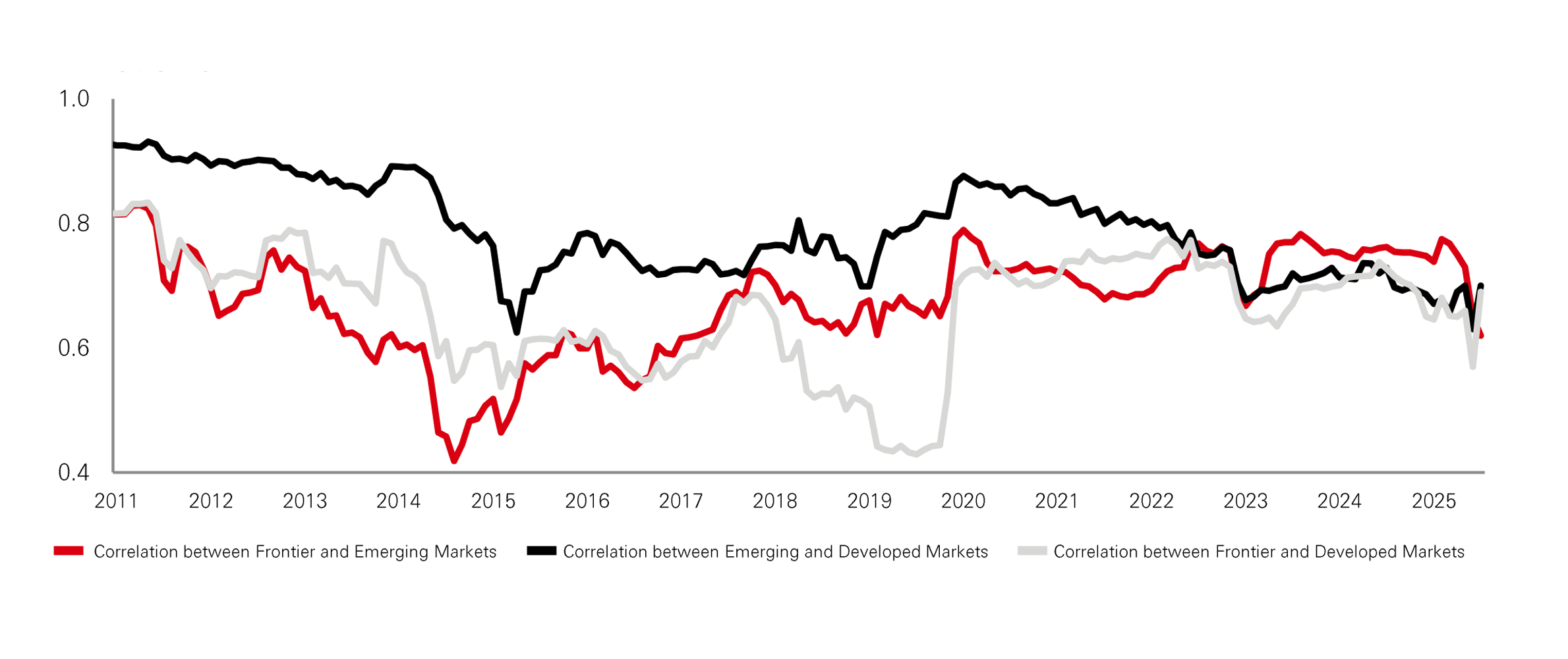 Frontier Markets may offer a way to expand diversification within a portfolio. This has been a more challenging aspect of portfolio management in recent years as Emerging and Developed Markets correlations have risen.