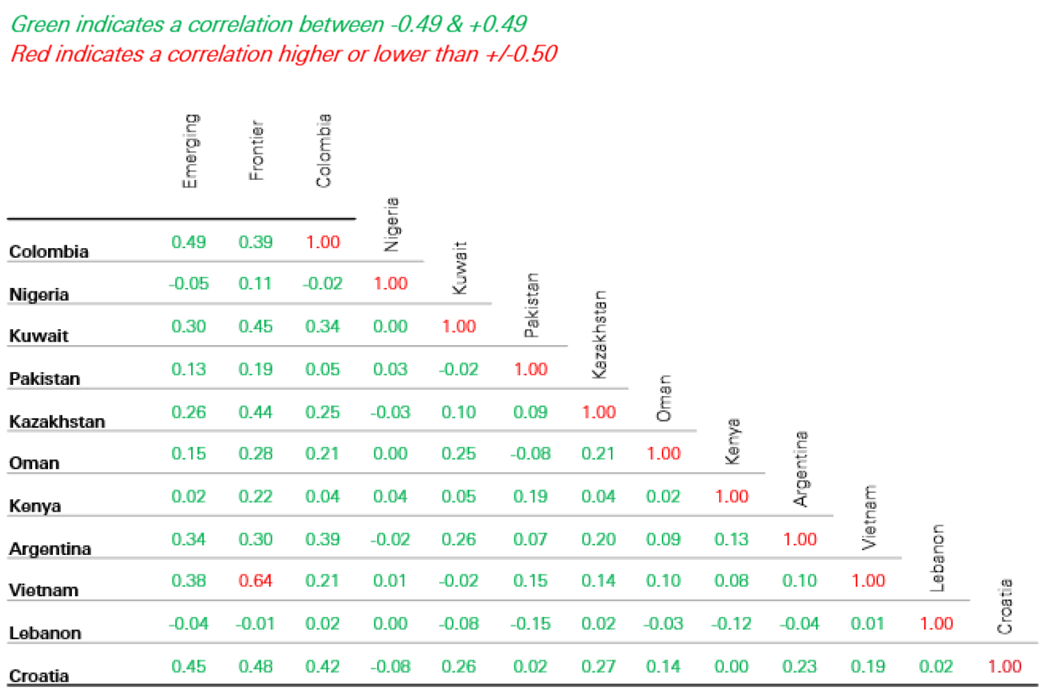 Another is that stock prices are generally dominated by local investors focussed on local issues, and this helps drive correlations down. The intra-correlations within these markets are remarkably low. By distributing your investments within Frontier countries, for example across Kazakhstan and Kuwait, you are diversifying effectively (0.10, see the correlation table below). These markets do not meaningfully move together.