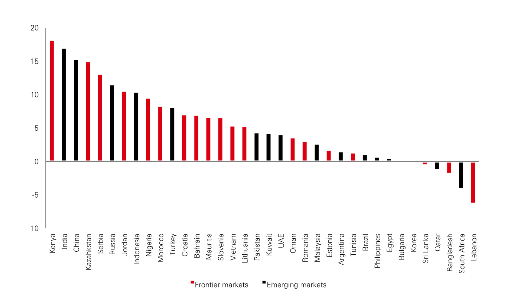 Source: Bloomberg, weekly data (Wednesday to Wednesday) from 25 March 2020 to 26 March 2025. Frontier Markets: MSCI Frontier Markets Daily TR Net USD; Emerging Markets: MSCI Emerging Markets Daily TR Net USD. Standard MSCI Country indices in USD. The information provided is for illustrative purpose only. This information shouldn't be considered as a recommendation to invest in the specific country mentioned. Costs may vary with fluctuations in the exchange rate. Diversification does not ensure a profit or protect against loss.