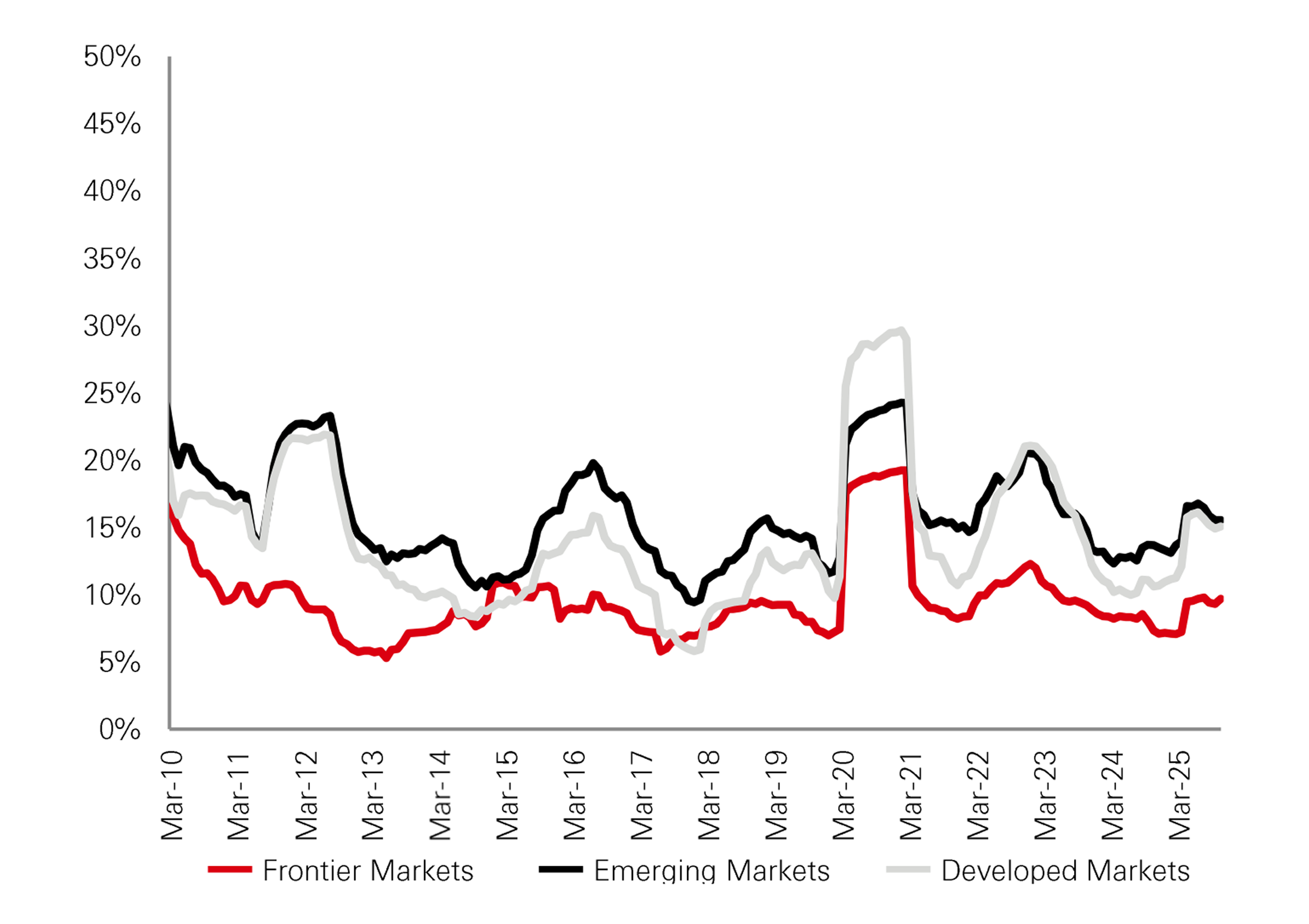 Low intra-country correlation within frontier markets has resulted in volatility lower than emerging markets historically