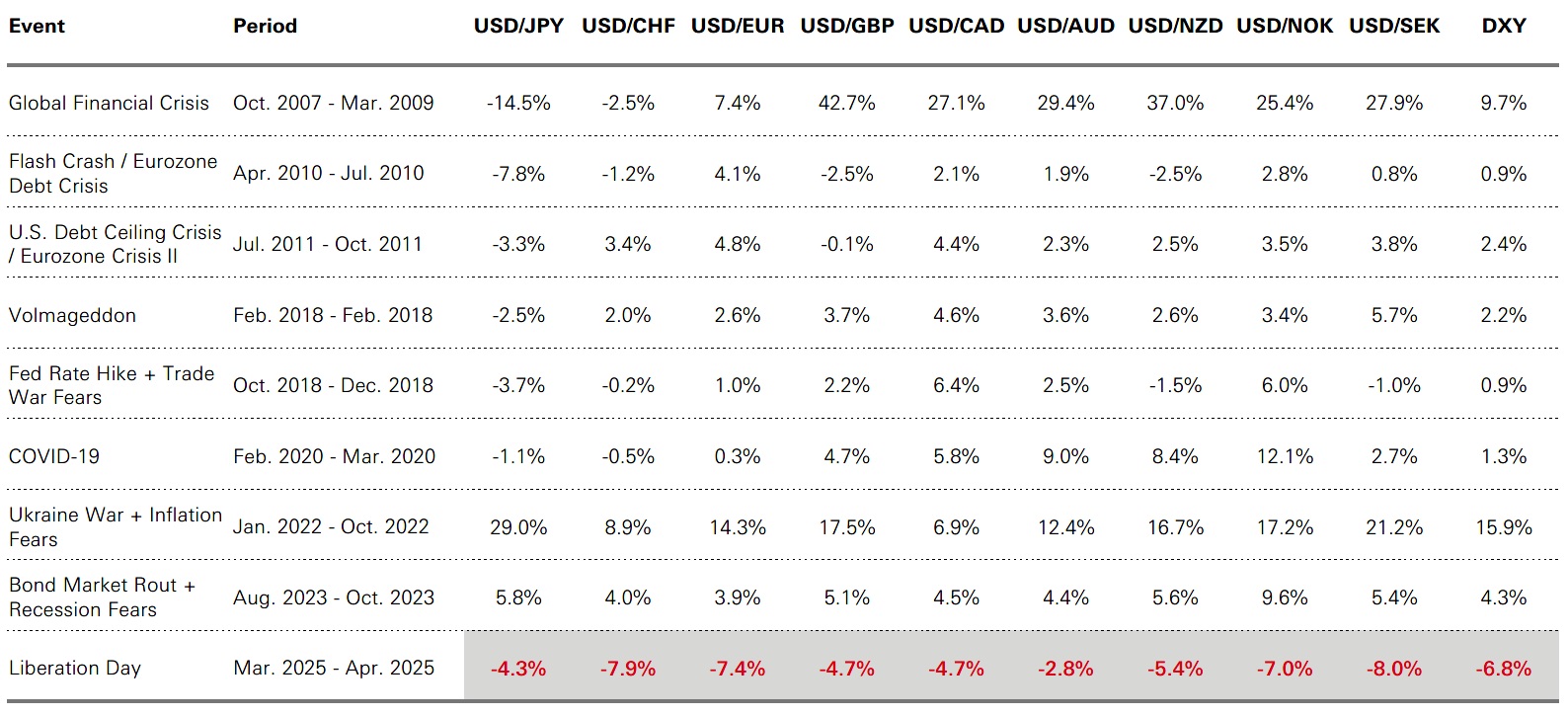 Further evidence of this shift can be seen in the performance of the dollar relative to other safe-haven currencies, such as the Japanese yen (JPY) and the Swiss franc (CHF). During recent risk-off episodes, the dollar underperformed these currencies, raising questions about its ability to maintain its traditional role in times of crisis.