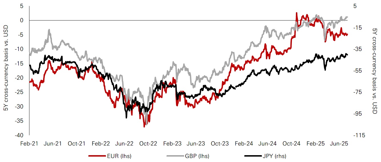 Cross-currency basis trends further hint at waning demand for US assets, possibly reflecting reduced FX-hedged flows from foreign institutions. If confirmed, this would erode one of the key pillars supporting the dollar’s dominance.